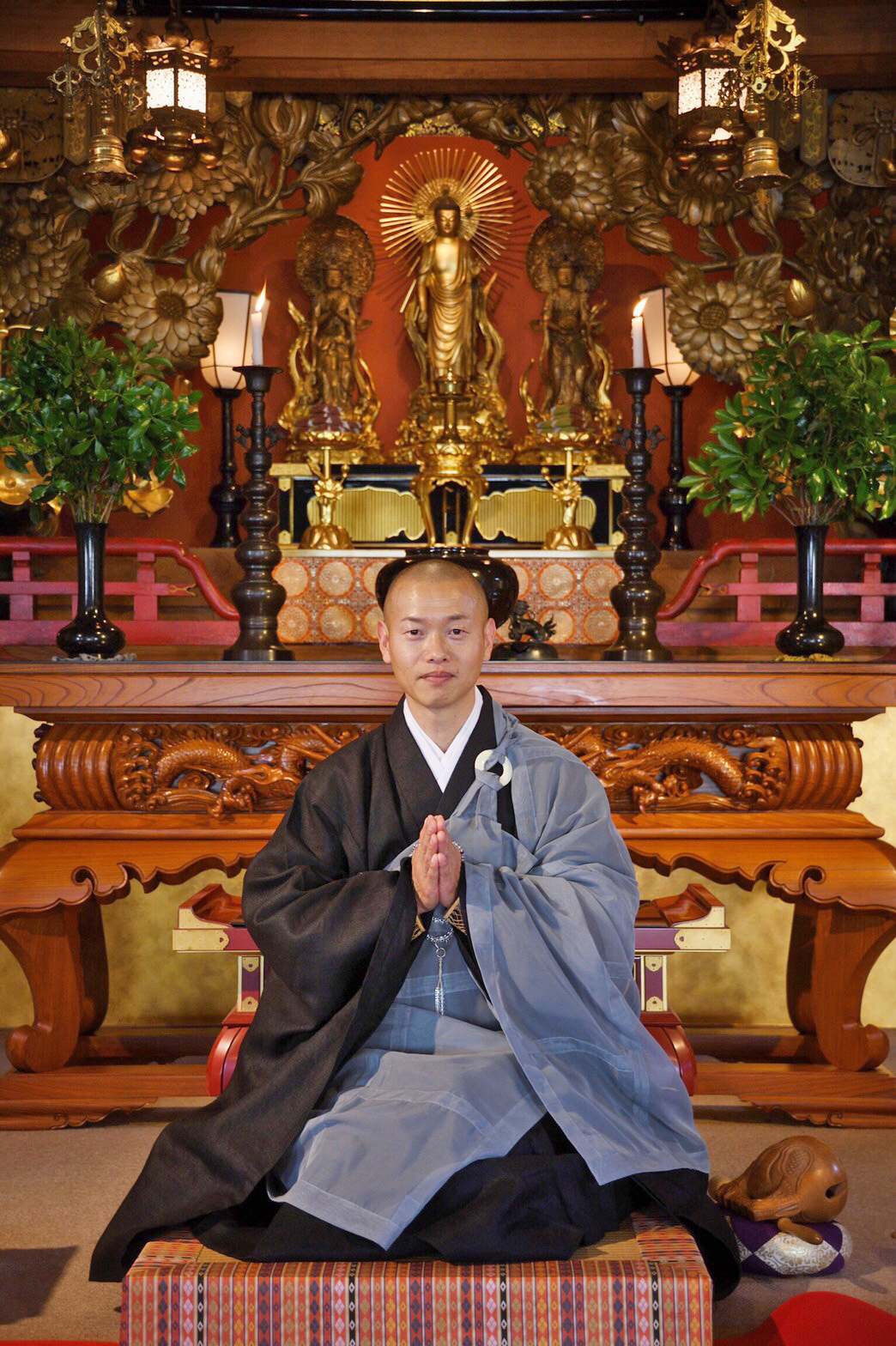 正座が苦手な方は椅子に腰掛けても結構です。木魚を叩いて一緒にお念仏しましょう。どうぞお気軽にお越しください。