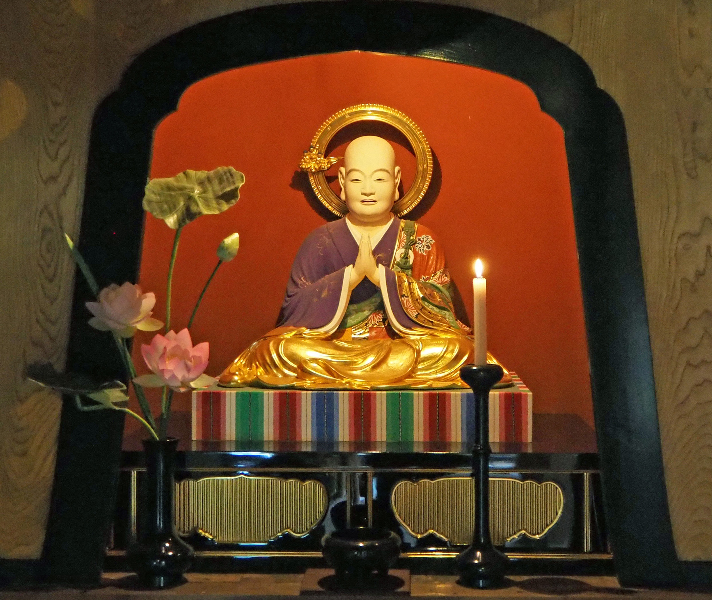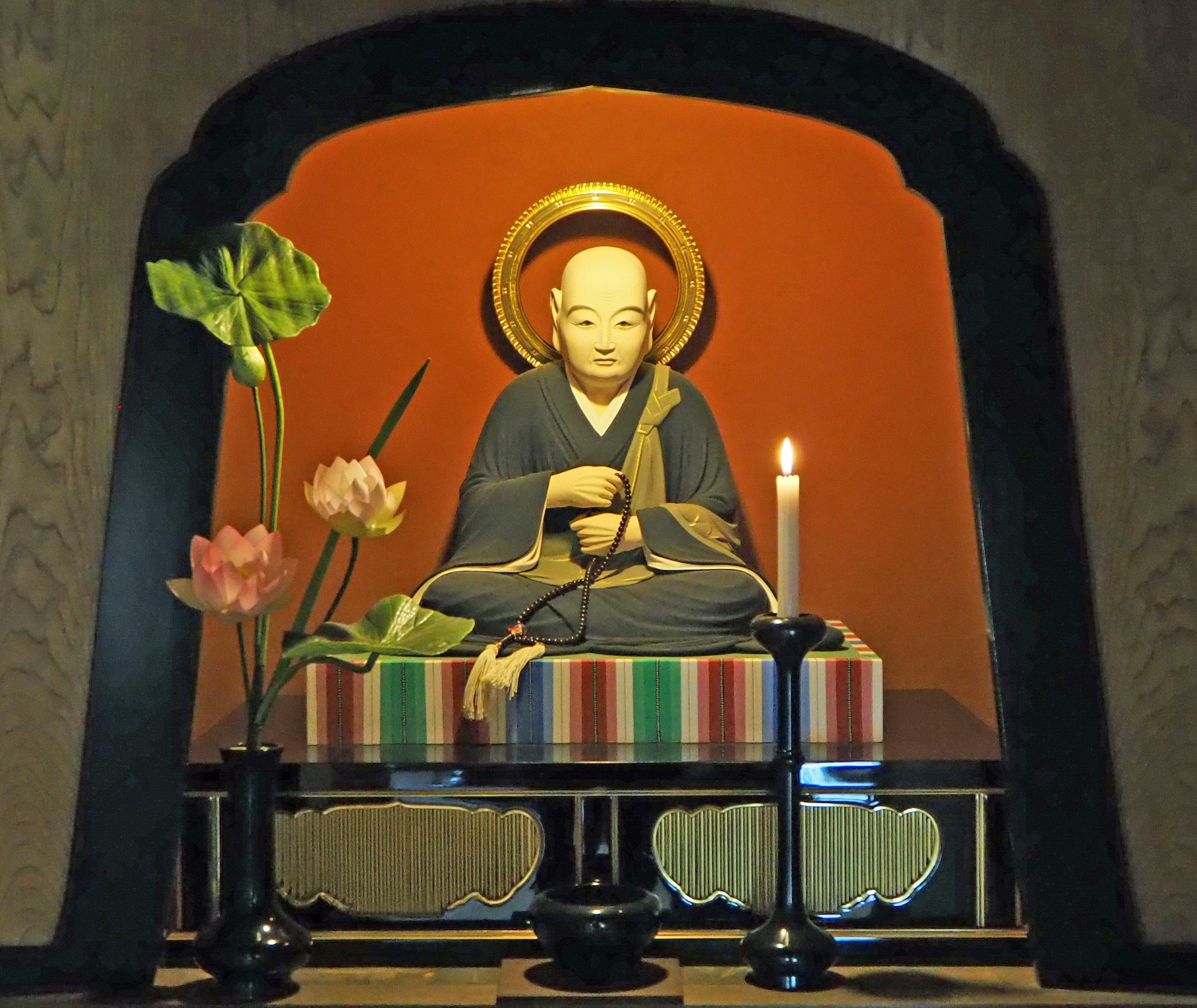 浄土宗開祖(1133〜1212)岡山・美作の生まれ、討たれた父の遺誡によって出家、比叡山に登って厳しい修行をこなして、一切経を5度読破したが、人々を救う道が開ませんでしたが、恵信僧都源信の『往生要集』や善導大師の『観経疏』に出会い、「南無阿弥陀佛」と声に出して称えれば、必ず仏の救済を受けてお浄土に生まれることができる、それこそが救いの道だと決意し、浄土宗を開きました。
