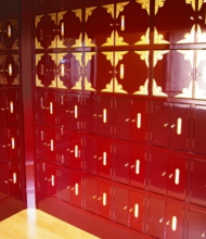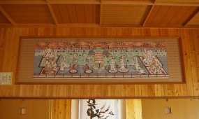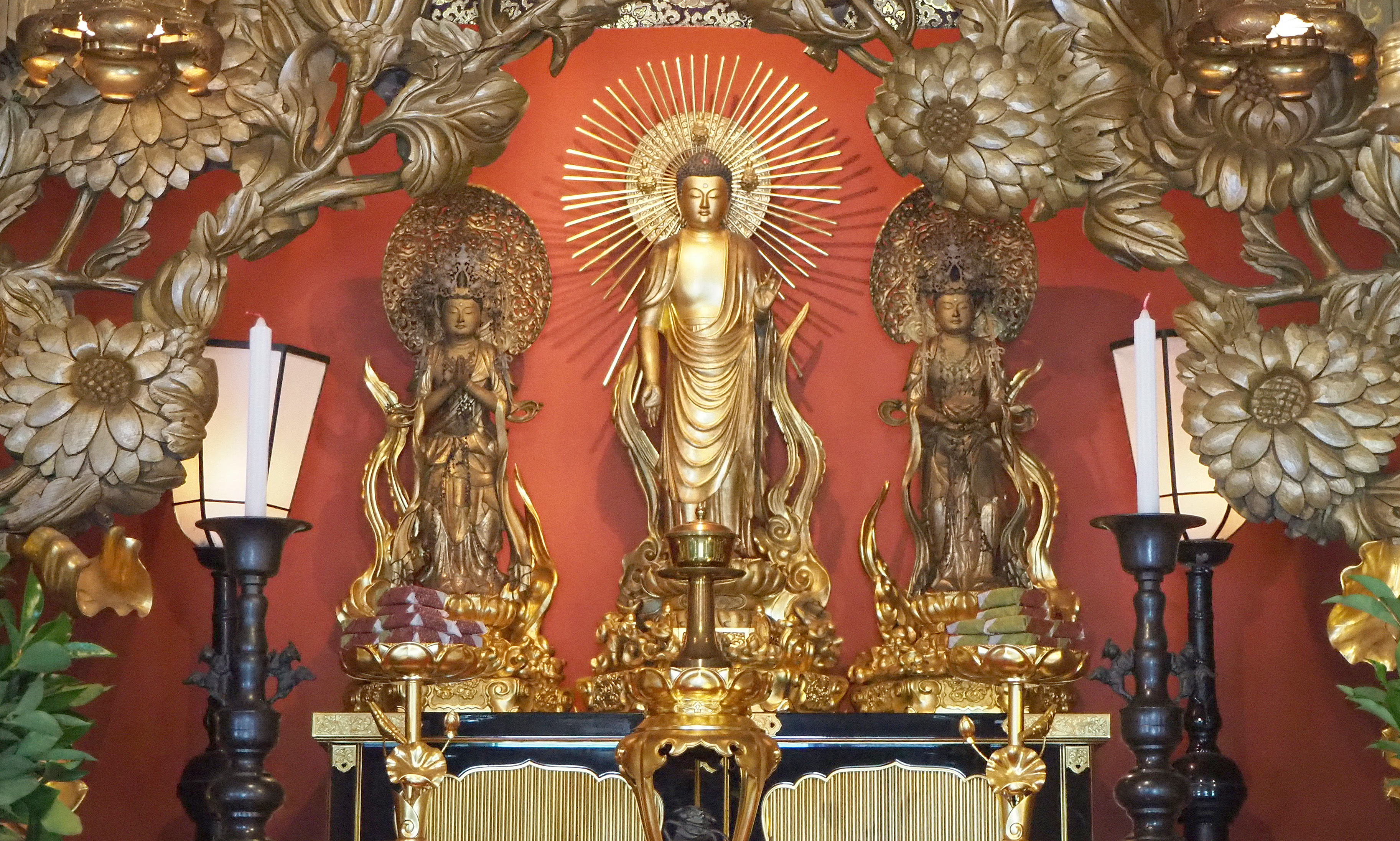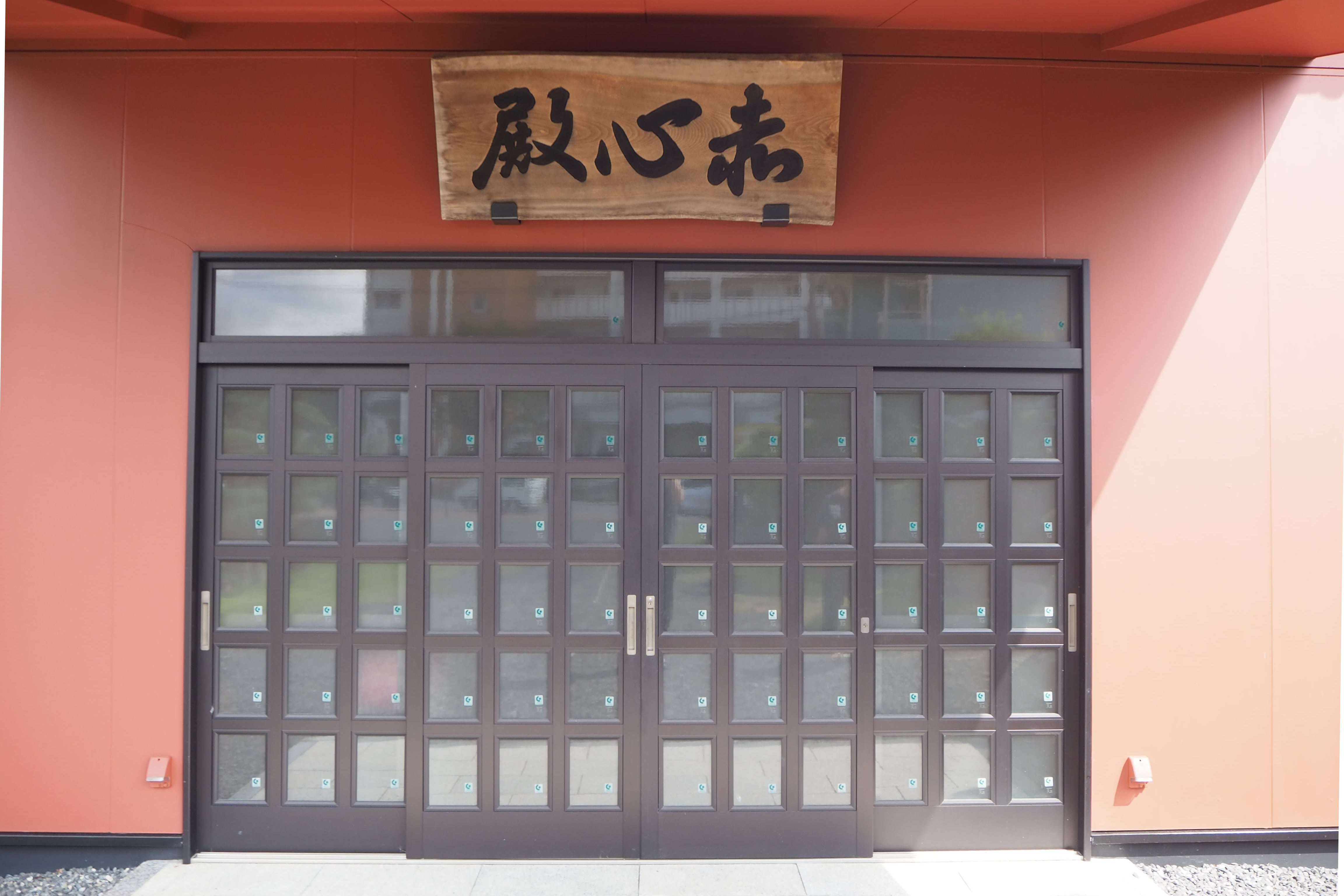 平成22年に完成した赤心殿には釈迦如来座像が安置されています。脇侍に文殊菩薩と普賢菩薩の釈迦三尊佛。釈迦如来像は木地仏で楠の中でも大変珍しいと言われる赤楠が用いられ、美しい木目で彫刻されています。右手は恐れを打ち消す施無畏印を結び、左手はすべての願いを叶えると言われる与願印を結んでいます。