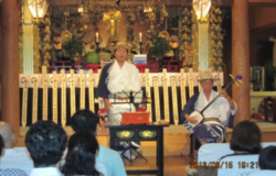 恒例の行事となっております新盆精霊送りの法要と華燈籠会が、今年も賑やかに行われました。今年で7回目となる朝熊町の河崎音頭保存会の方による河崎音頭の奉納は、歌の解説も交えて披露していただき、より分かりやすく親しみのあるものとなりました。江戸情緒豊かな伊勢の伝統行事も続けてまいりたいと思います。この夏は猛暑にもかかわらず、沢山の方がお参りに来られ、かき氷やヨーヨーが大変喜ばれました。